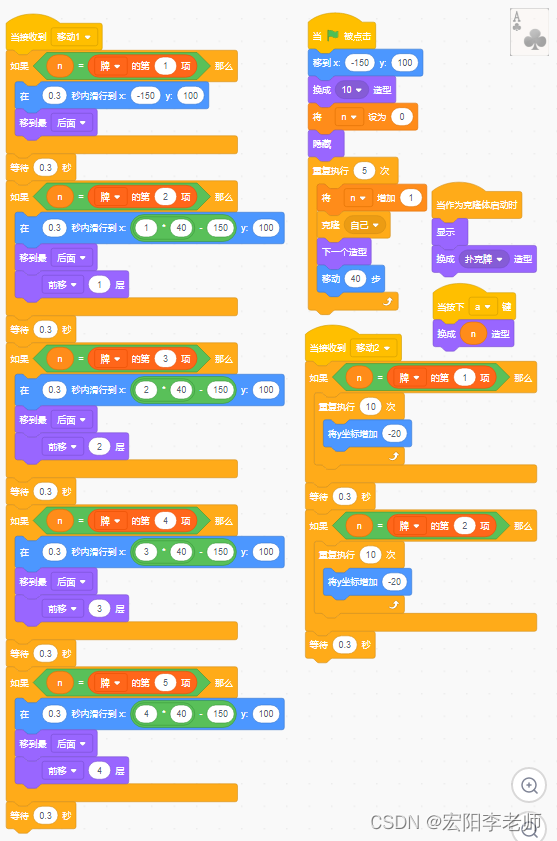 1)运行程序,角色、背景如图所示(五张草花牌面按照从小到大顺序排列);
