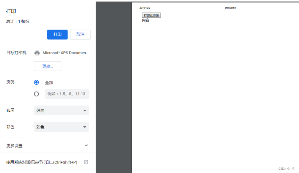 print() 方法用于打印当前窗口的内容。调用 print() 方法会产生一个打印预览弹框,让用户可以设置打印请求。最简单的打印就是直接调用window.print(),当然用 document.execCommand('print') 也可以达到同样的效果。默认打印页面中body里的所有内容。