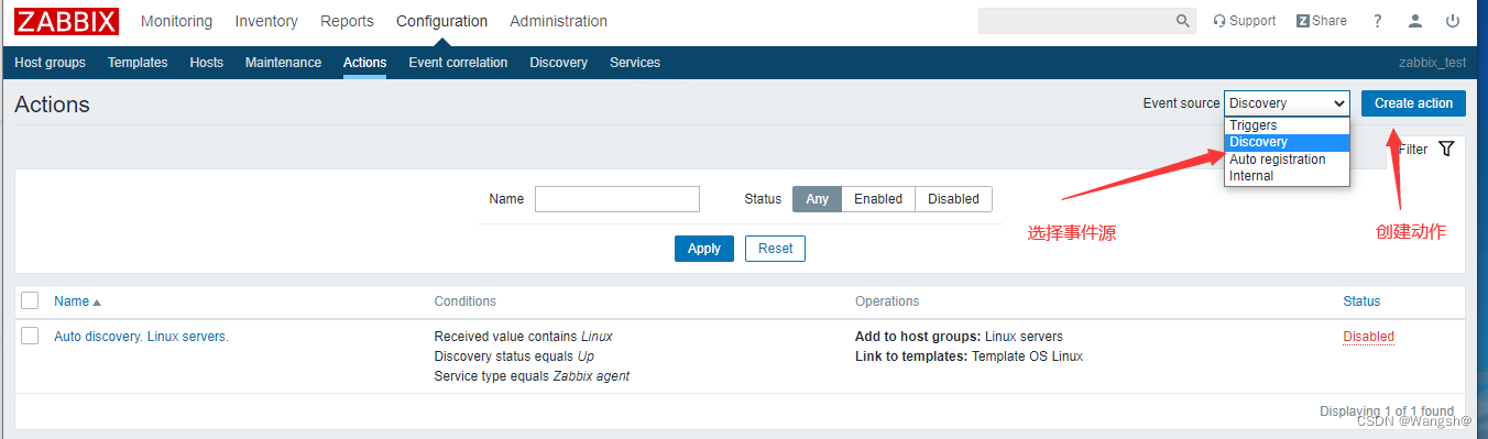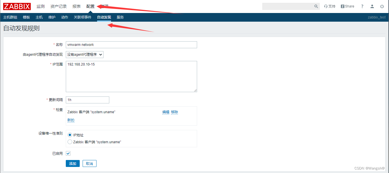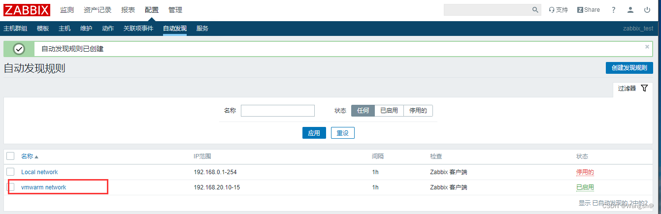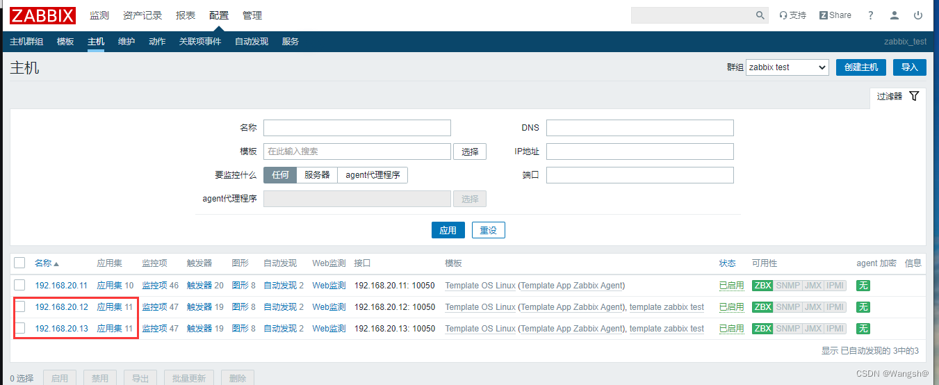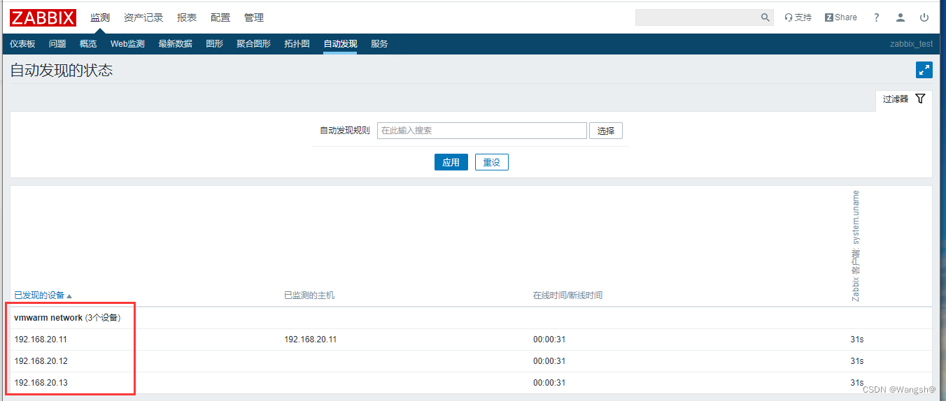 进入监控-自动发现,可以看到已经自动发现了对应ip地址段内的三台机器