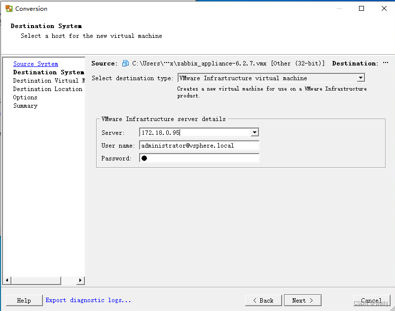 7:按照下图进行选择Powered off,VMware Workstation or other VMware virtual macine,然后指定Zabbix Appliance文件的位置,下一步。