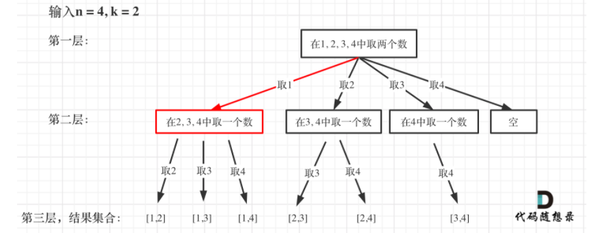 回溯函数终止条件:path这个数组的大小如果达到k,说明我们找到了一个子集大小为k的组合,在图中path存的就是根节点到叶子节点的路径