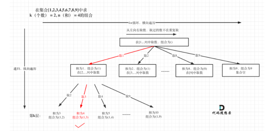 (1)假设n = 4,k = 4,就四个数,还求四个数的组合,那必然只有一个组合,从2开始for循环再找其他数没有意义。所以,可以剪枝的地方就在递归中每一层的for循环所选择的起始位置,在循环中i就是循环的起始位置。也就是说for循环的开始位置到结束位置一共的元素个数 (2)过程: 已经选择的元素个数:path.size(); 还需要的元素个数为: k - path.size(); 在集合n中至多要从该起始位置 : n - (k - path.size()) + 1,开始遍历。也就是说 n - (k - path.size()) + 1是最晚的起始位置,如果超过了这个位置找元素,path的元素个数不可能到达k个。这里面+1是闭区间的意思。 最终优化后的代码: 题目链接 过程图:和上一题组合类似,仍然是先取某个值,然后再从其他数中k-1个进行组合。 思路:回溯三部曲。 确定递归函数参数:题目中的n和k,sum(已经收集的元素的总和也就是path里元素的总和),startIndex为下一层for循环搜索的起始位置。 确定终止条件:path.size() 和 k相等且sum=n 单层搜索过程: path收集每次选取的元素,sum来统计path里元素的总和。别忘了回溯。 3.代码:List> res = new ArrayList<>();