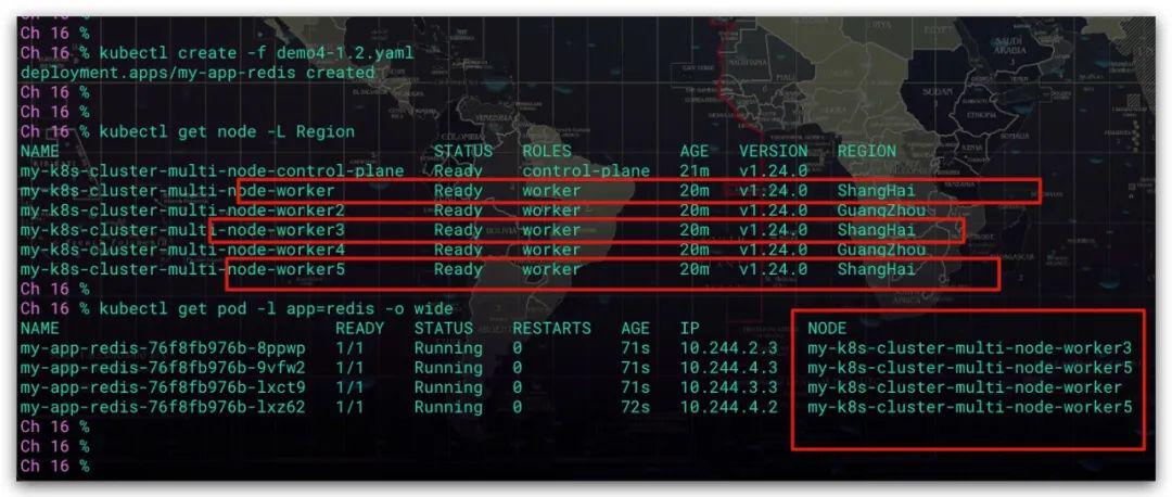 # 应用的缓存服务apiVersion: apps/v1kind: Deploymentmetadata: name: my-app-redisspec: # Pod副本数量 replicas: 4 selector: matchLabels: app: redis # Pod模板 template: metadata: # 标签信息: 应用的后端服务 labels: app: redis spec: # 亲和性 affinity: # Pod亲和性规则 podAffinity: # 偏好性的调度规则, 但不会影响已在节点上运行的Pod preferredDuringSchedulingIgnoredDuringExecution: - weight: 70 # 权重范围: 1~100, 权重值越大, 优先级越高 podAffinityTerm: topologyKey: Region # 标签选择器 labelSelector: matchLabels: app: backend # 容器信息 containers: - name: my-app-redis image: redis:3.2-alpine效果如下所示。缓存服务的4个Pod均运行同样位于上海的节点上。需要注意的是,由于这里是偏好性调度。故如果当上海的节点由于某种原因导致无法调度Pod到其上运行,调度器选择其他地域的节点进行调度也是合法的、允许的。比如这里位于广州的节点