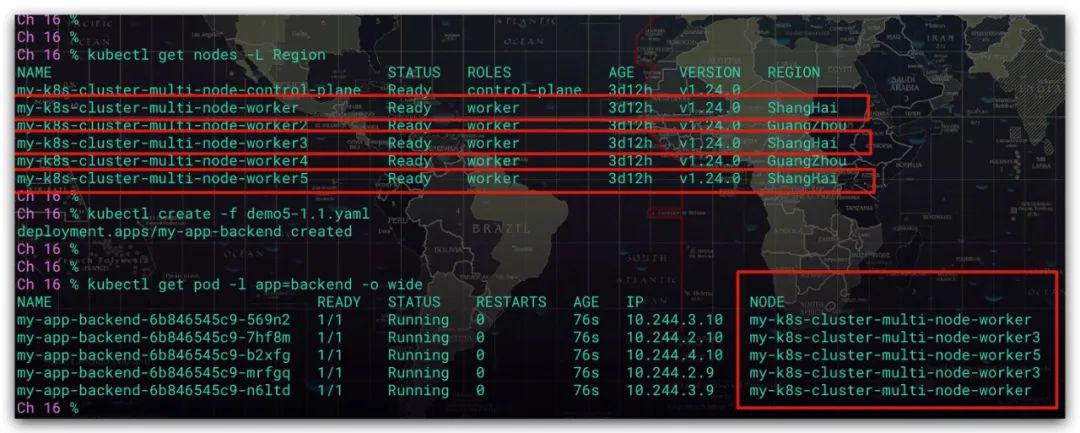 这里提供了一个存在5个工作节点的K8s集群,然后我们使用Deployment部署了应用的后端服务。这里为了便于后续演示,我们规定后端服务的Pod只允许运行在上海的节点上