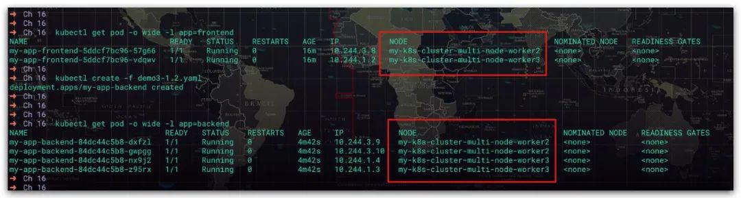 # 应用的后端服务apiVersion: apps/v1kind: Deploymentmetadata: name: my-app-backendspec: # Pod副本数量 replicas: 4 selector: matchLabels: app: backend # Pod模板 template: metadata: # 标签信息: 应用的后端服务 labels: app: backend spec: # 亲和性 affinity: # Pod亲和性规则 podAffinity: # 强制性的调度规则, 但不会影响已在节点上运行的Pod requiredDuringSchedulingIgnoredDuringExecution: - topologyKey: kubernetes.io/hostname # 标签选择器 labelSelector: matchLabels: app: frontend # 容器信息 containers: - name: my-app-backend image: tutum/dnsutils command: - sleep - infinity效果如下所示。后端服务的5个Pod均运行在my-k8s-cluster-multi-node-worker2、my-k8s-cluster-multi-node-worker3节点上