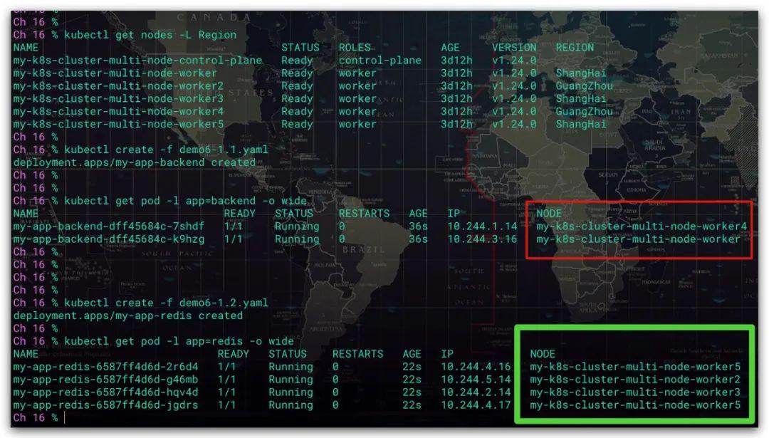 # 应用的缓存服务apiVersion: apps/v1kind: Deploymentmetadata: name: my-app-redisspec: # Pod副本数量 replicas: 4 selector: matchLabels: app: redis # Pod模板 template: metadata: # 标签信息: 应用的后端服务 labels: app: redis spec: # 亲和性 affinity: # Pod反亲和性规则 podAntiAffinity: # 偏好性的调度规则, 但不会影响已在节点上运行的Pod preferredDuringSchedulingIgnoredDuringExecution: - weight: 100 # 权重范围: 1~100, 权重值越大, 优先级越高 podAffinityTerm: topologyKey: kubernetes.io/hostname # 标签选择器 labelSelector: matchLabels: app: backend - weight: 1 # 权重范围: 1~100, 权重值越大, 优先级越高 podAffinityTerm: topologyKey: Region # 标签选择器 labelSelector: matchLabels: app: backend # 容器信息 containers: - name: my-app-redis image: redis:3.2-alpine效果如下所示。缓存服务的4个Pod均运行在与后端服务Pod所在节点不同的节点上。但这里由于是偏好性调度,当最终结果未满足两个服务运行在不同的地理位置时,即调度器选择相同地理位置的节点进行调度也是合法的、允许的