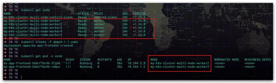 # 应用的前端服务apiVersion: apps/v1kind: Deploymentmetadata: name: my-app-frontendspec: # Pod副本数量 replicas: 2 selector: matchLabels: app: frontend # Pod模板 template: metadata: # 标签信息: 应用的前端服务 labels: app: frontend spec: # 容器信息 containers: - name: my-app-frontend image: jocatalin/kubernetes-bootcamp:v1效果如下所示,可以看到前端服务运行了2个Pod。分别在my-k8s-cluster-multi-node-worker2、my-k8s-cluster-multi-node-worker3节点上
