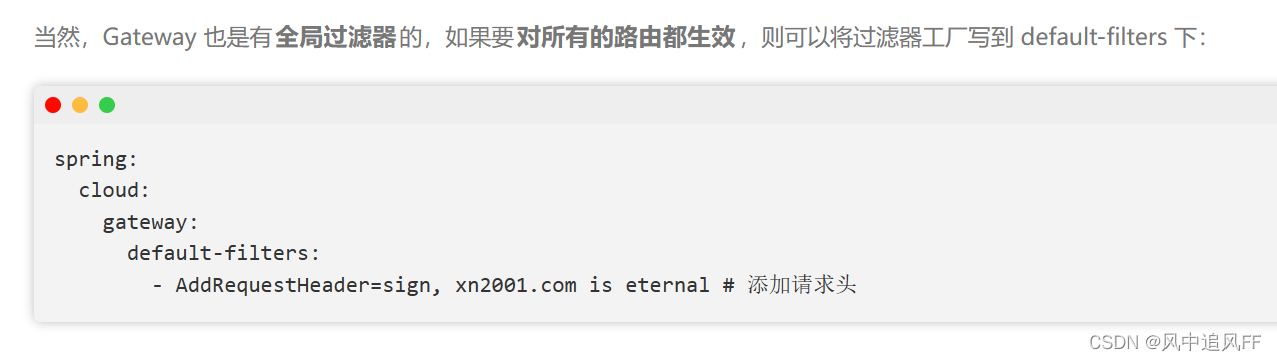 全局过滤器的作用也是处理一切进入网关的请求和微服务响应,与 GatewayFilter 的作用一样。区别在于 GlobalFilter 的逻辑可以写代码来自定义规则;而 GatewayFilter 通过配置定义,处理逻辑是固定的。