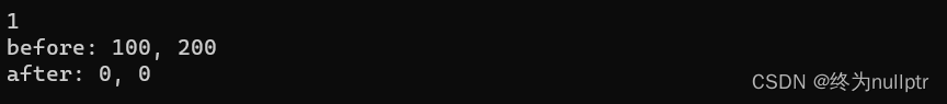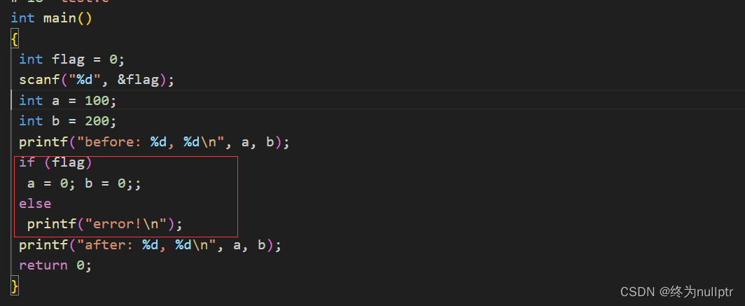 {int flag = 0;scanf("%d", &flag);int a = 100;int b = 200;printf("before: %d, %d\n", a, b);if (flag)INIT_VALUE(a, b);elseprintf("error!\n");printf("after: %d, %d\n", a, b);return 0;