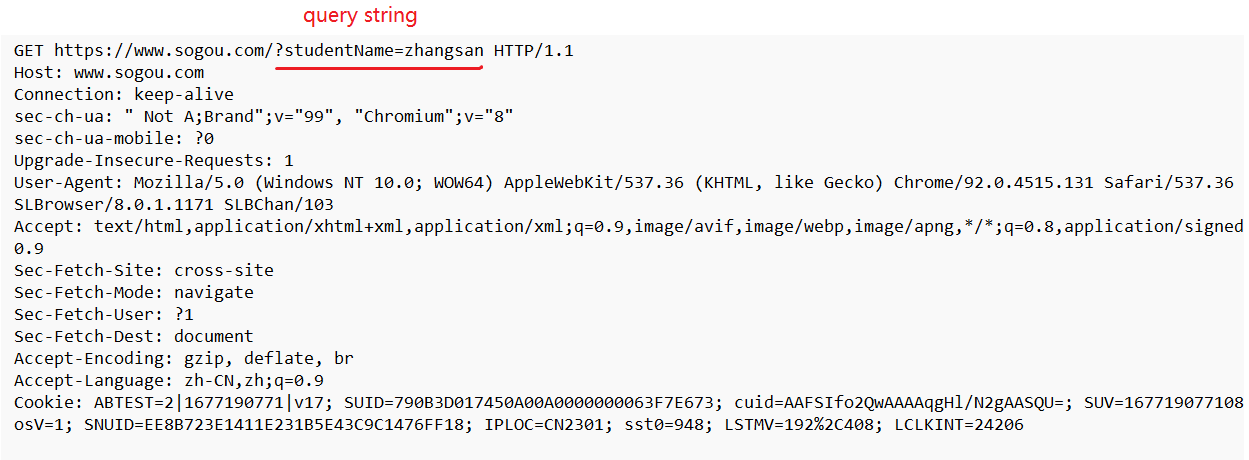 抓包之后,我们可以看到请求中的 URL里面多了query string 并且有一个键值对