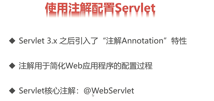 public class AnnotationServlet extends HttpServlet {@Overrideprotected void doGet(HttpServletRequest req, HttpServletResponse resp) throws ServletException, IOException {resp.getWriter().println("im annotation servlet!");}