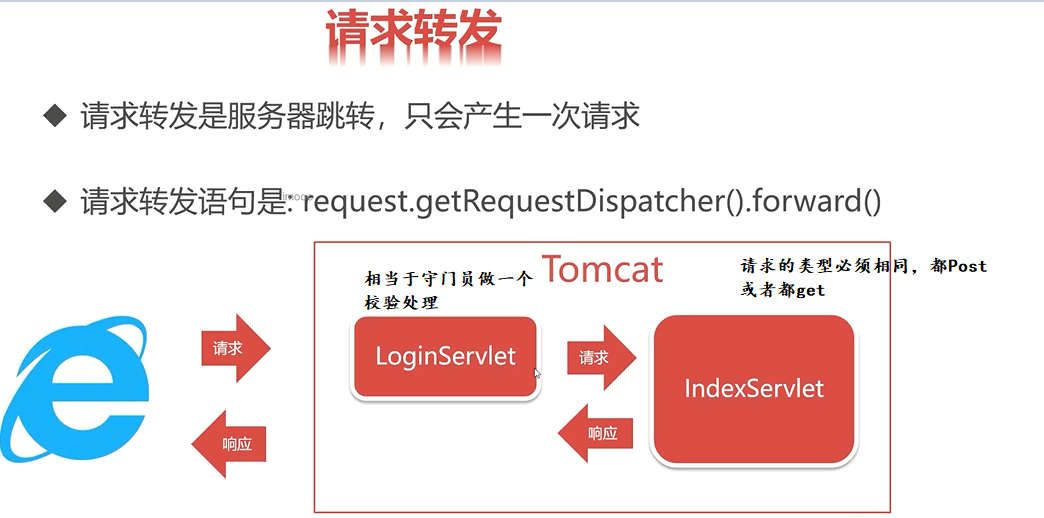请求转发:一个是一次即可请求完成,紧密相关,因为由一个tomcat管理,只能在应用的内部进行转发