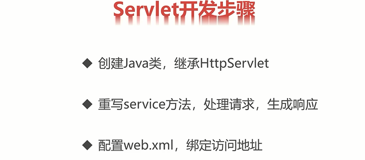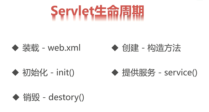 public class FirstServlet extends HttpServlet {//第一阶段装载,读取xml文件,加载配置信息,并未创建//第一次访问(地址栏输入)的时候才会创建servlet实体对象public FirstServlet() {System.out.println("正在创建...");}//创建之后初始化@Overridepublic void init() throws ServletException {System.out.println("正在初始化");}@Overrideprotected void service(HttpServletRequest req, HttpServletResponse resp) throws ServletException, IOException {System.out.println("正在处理。。");}//在tomcat关闭前会自动的关闭销毁@Overridepublic void destroy() {System.out.println("正在销毁");}