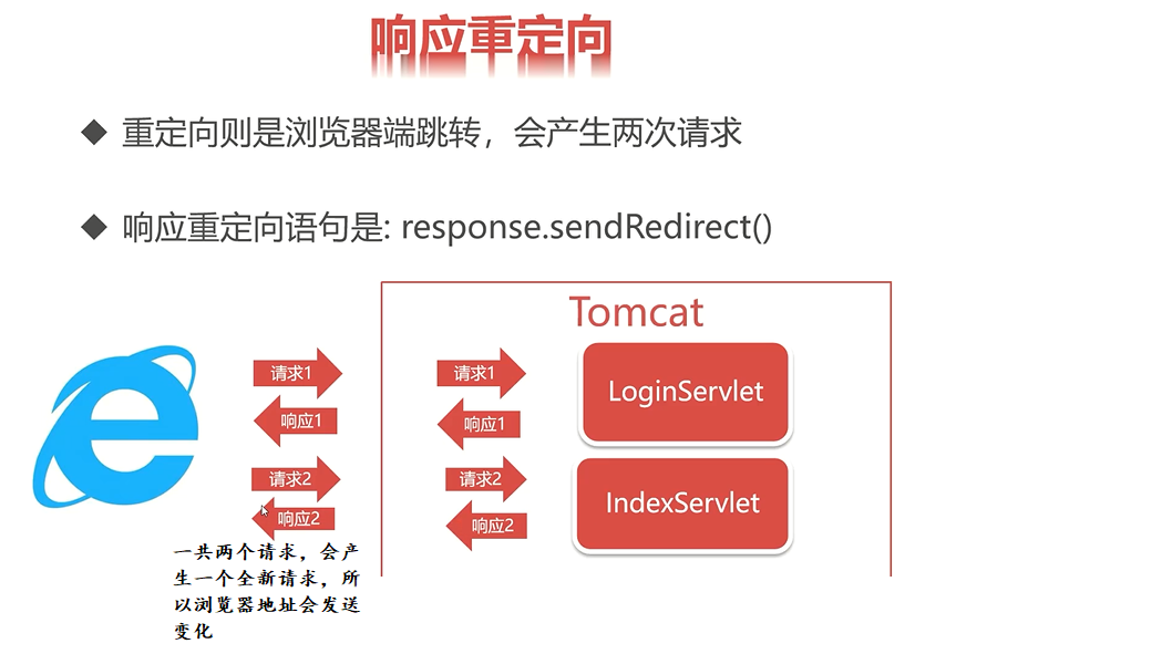 响应重定向:不是紧密相连的对象,默认get方式,因为两次响应,可以跳到其他服务器管理站点如百度
