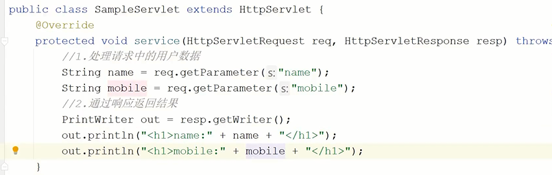 @Overrideprotected void doGet(HttpServletRequest req, HttpServletResponse resp) throws ServletException, IOException {String name = req.getParameter("name");String mobile = req.getParameter("mobile");PrintWriter out = resp.getWriter();out.println("GET");out.println(""+name+"