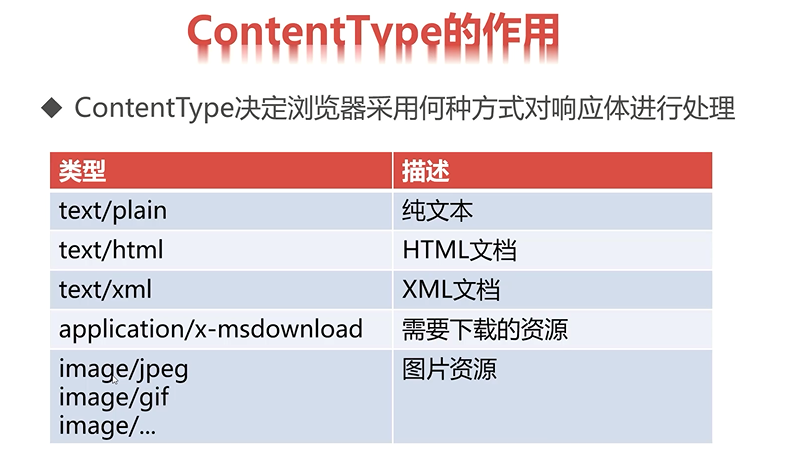 表示数据的格式,它是一个 HTML 页面,同时页面的编码格式是 UTF-8,按照这些信息,可以正常地解析出内容。content-type 为不同的值时,浏览器会做不同的操作,如果 content-type 是 application/octet-stream,表示数据是一个二进制流,此时浏览器会走下载文件的逻辑,而不是打开一个页面。
