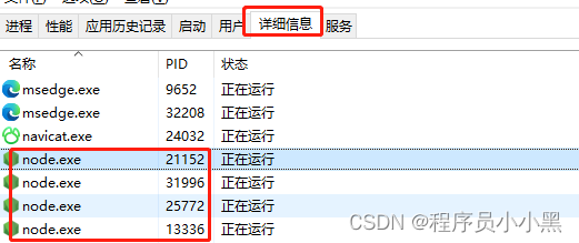 我这里有4个node进程,需要全部关闭;如果你有其他在运行的项目,需要通过方式5精确关闭