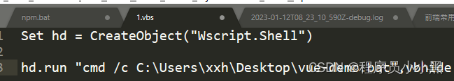 Set hd = CreateObject("Wscript.Shell")hd.run "cmd /c C:\Users\xxh\Desktop\vue-demo.bat",vbhide
