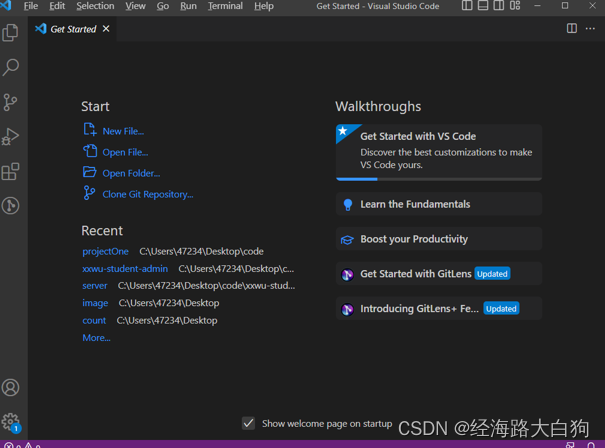 首先推荐开发工具Visual Studio Code,也就是人们常说的vscode。目前vscode在日常开发工作中很常用,而且他对于很多我们前端开发所需的插件,GIT SVN版本控制工具的支持也非常成熟。打开一个空的vscode界面
