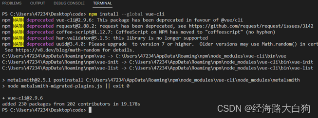 这是Vue所提供的官方命令行工具,可用于快速搭建我们所需的单页面应用。需要执行命令,注意下面的命令是两个中划线再加global