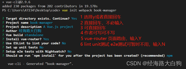 然后就是脚手架所提供的安装询问过程: