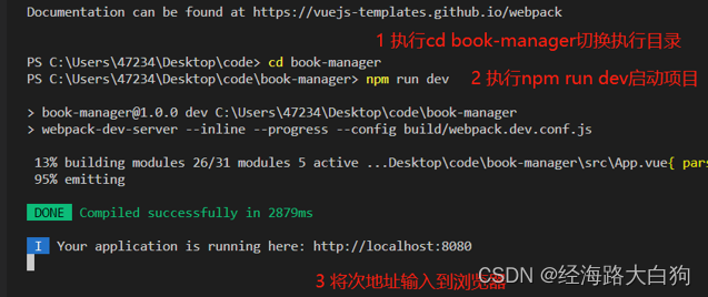 安装完成之后,即可输入命令cd book-manager,然后控制台的命令行目录改变,之后执行启动命令npm run dev。启动完成之后,可将http://localhost:8080输入到浏览器上