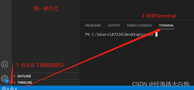 控制台也就是Terminal,如果你的vscode还没有打开Terminal,这里有2个入口。第一是左下角的错误提示区域,第二是顶部菜单的Terminal。如下图所示,不管你的英语水平如何,都不建议使用汉化的vscode或者想办法安装汉化包去使其汉化,我们更应该不断的练习自己的英语水平,哪怕只是从开发工具入手
