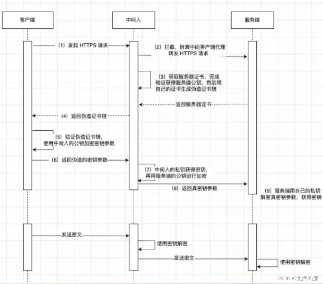 1、截取客户端发送的包含证书的报文,伪装成服务端,把自己的证书发给客户端,然后拿到客户端返回的包含对称加密通信密钥的报文,生成中间人与客户端对称加密的密钥
