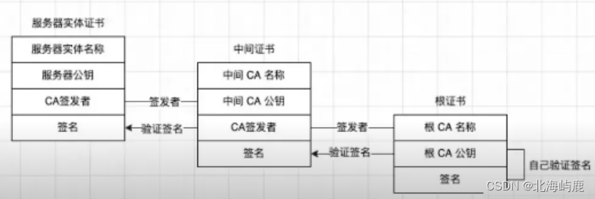 1.3浏览器选代校验每张证书的签名,最后会找到自签名的根证书(签发者和使用者是同一个人),由于浏览器已经集成了根证书可以充分信任根证书的公钥,完成最后的签名。服务器实体证书校验:访问的域名信息是否与证书一致、日期证书扩展校验等。