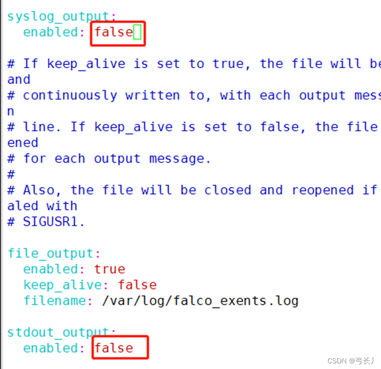 file_output:enabled: truekeep_alive: false#改为true是持续写入保持打开状态,false是有事件再打开写入 filename: /var/log/falco_events.log