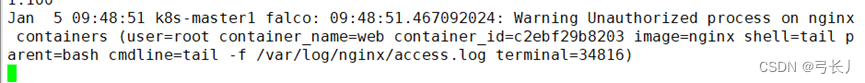 #运行新镜像,必须是容器,并且容器镜像开头是nginx 并设置白名单desc: testoutput: "Unauthorized process on nginx containers (user=%user.name container_name=%container.name container_id=%container.id image=%container.image.repository shell=%proc.name parent=%proc.pname cmdline=%proc.cmdline terminal=%proc.tty)"priority: WARNING