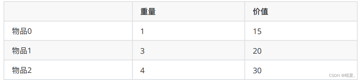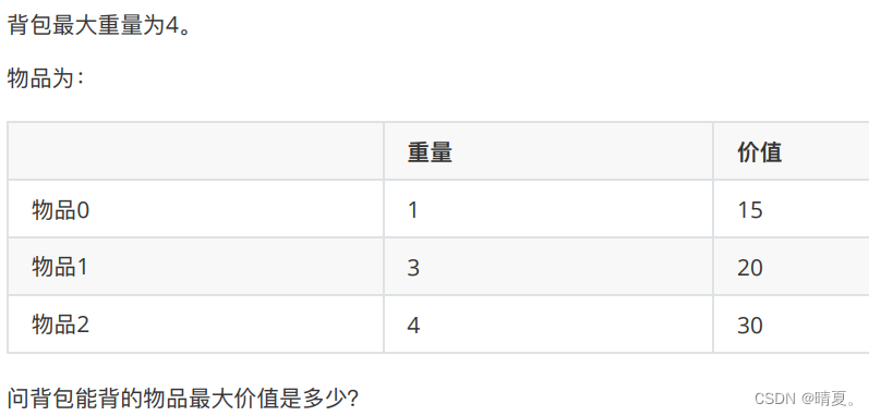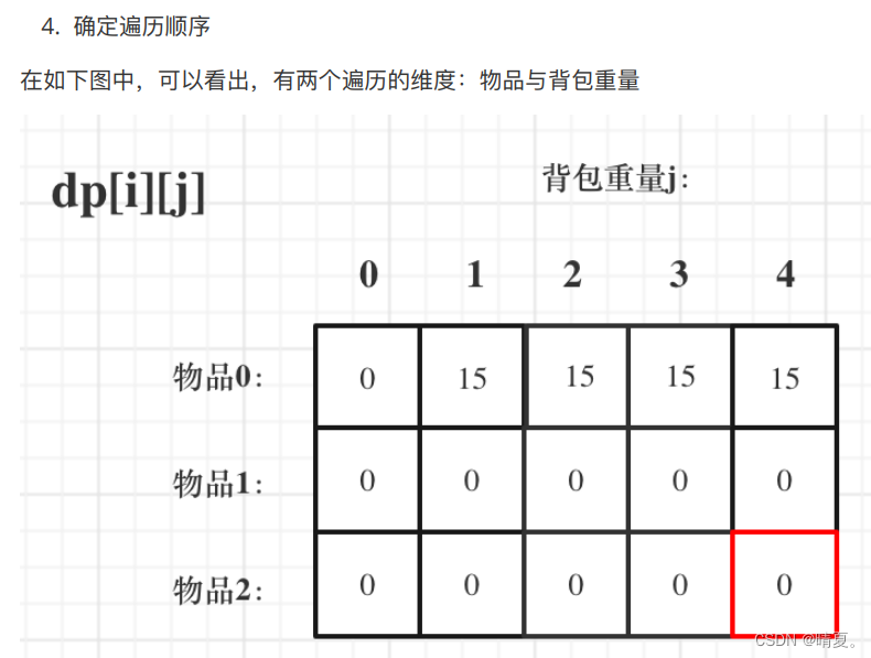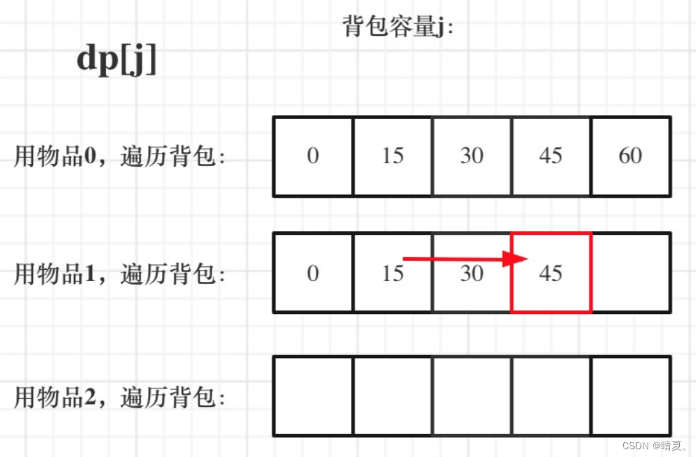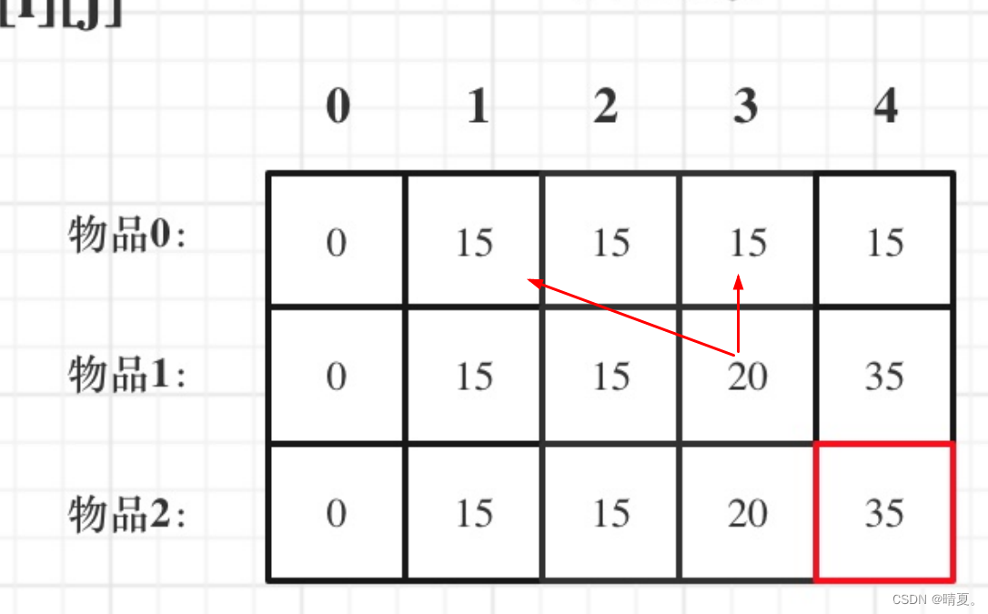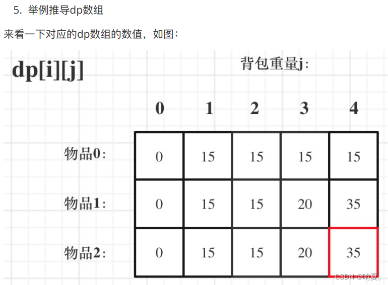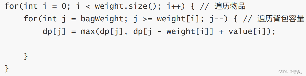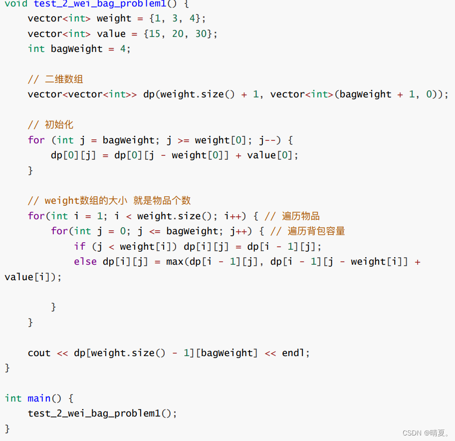 void test_1_wei_bag_problem() {vector weight = {1, 3, 4};vector value = {15, 20, 30};int bagWeight = 4;// 初始化vector dp(bagWeight + 1, 0);for(int i = 0; i < weight.size(); i++) { // 遍历物品for(int j = bagWeight; j >= weight[i]; j--) { // 遍历背包容量dp[j] = max(dp[j], dp[j - weight[i]] + value[i]);}}cout << dp[bagWeight] << endl;