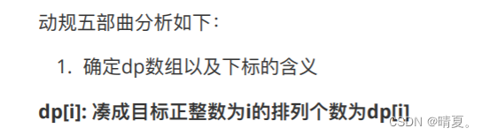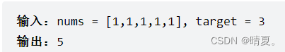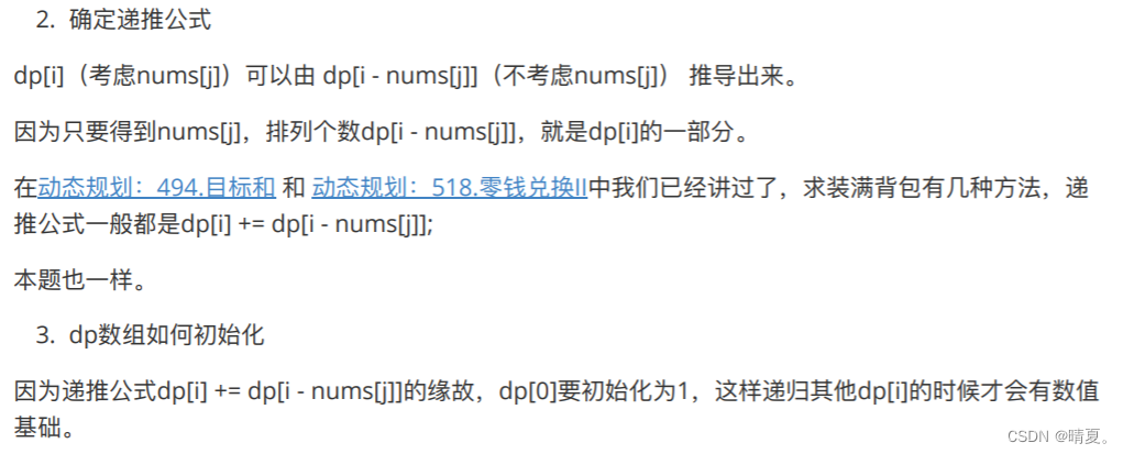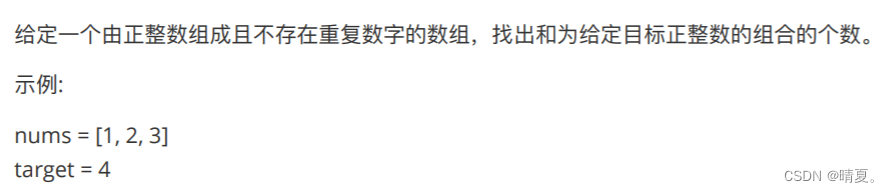 public:int combinationSum4(vector& nums, int target) {int len=nums.size();vector dp(target+1);dp[0]=1;for(int j=0;j<=target;j++){for(int i=1;i<=len;i++){if(j>=nums[i-1])dp[j]+=dp[j-nums[i-1]];}}return dp[target];}