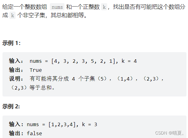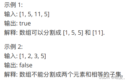 public:vector num;double allSum=0;bool findFlag=false;bool canPartition(vector& nums) {for(auto val:nums)allSum+=val;num=nums;dfs(0,0);return findFlag;}void dfs(double nowSum,int index){if(index>=num.size())return;if(nowSum==allSum/2){findFlag=true;return;}else{dfs(nowSum+num[index],index+1);dfs(nowSum,index+1);}}