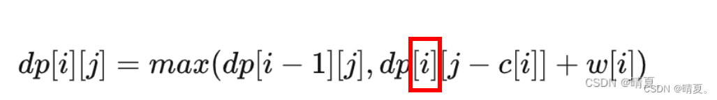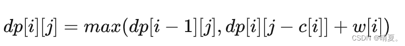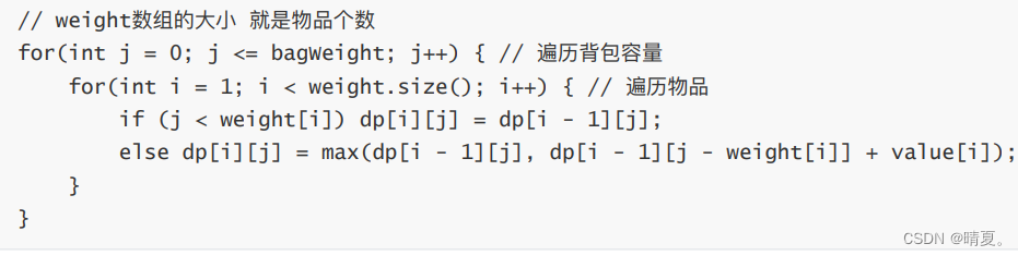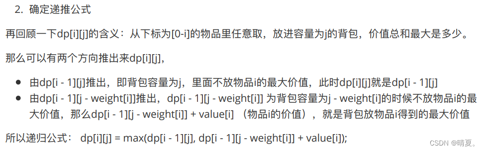 此时dp[j]有两个选择,⼀个是取⾃⼰dp[j],⼀个是取dp[j - weight[i]] + value[i],指定是取最⼤的,毕竟是求最⼤价值, 所以递归公式为