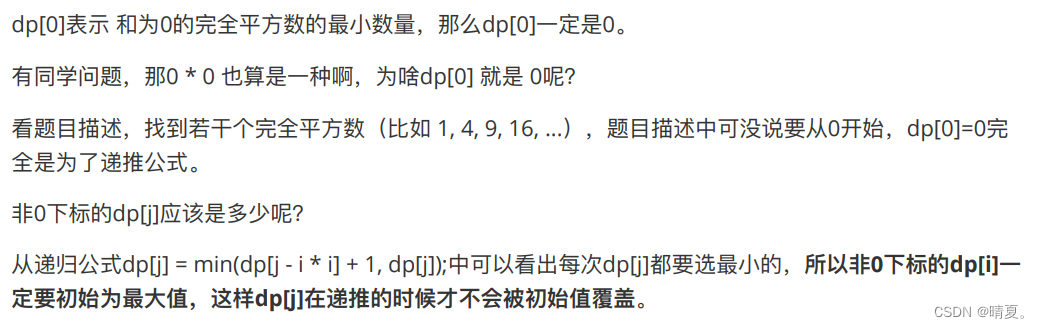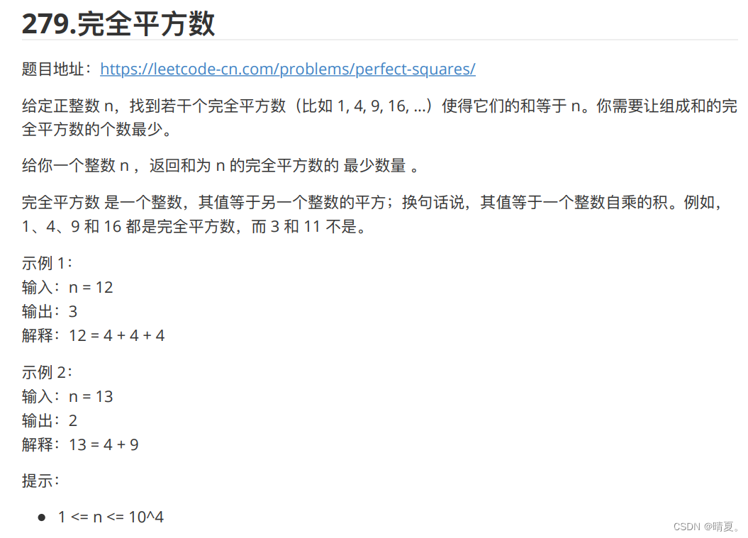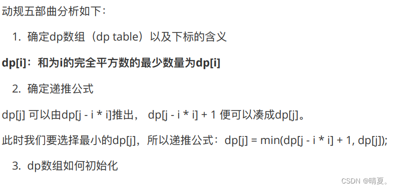 public:int numSquares(int n) {vector dp(n+1,INT_MAX);dp[0]=0;for(int i=1;i<=n;i++){for(int j=1;j*j<=i;j++){dp[i]=min(dp[i],dp[i-j*j]+1);}}return dp[n];}