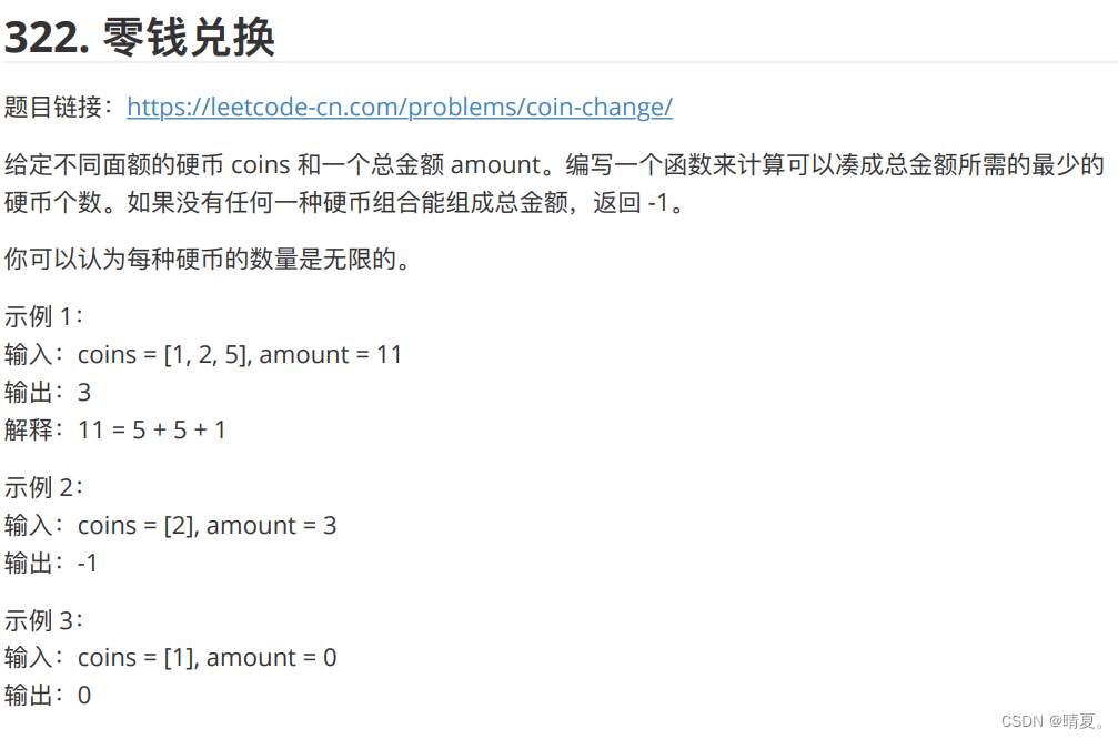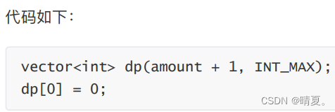 public:int coinChange(vector& coins, int amount) {if(amount==0)return 0;int len=coins.size();vector> dp(len+1,vector (amount+1,INT_MAX));dp[0][0]=0;for(int i=1;i<=len;i++){for(int j=0;j<=amount;j++){if(j>=coins[i-1])dp[i][j]=min(dp[i-1][j],dp[i][j-coins[i-1]]+1);else dp[i][j]=dp[i-1][j];}}if(dp[len][amount]>=INT_MAX)return -1;return dp[len][amount];}