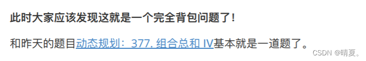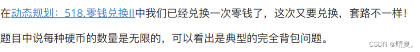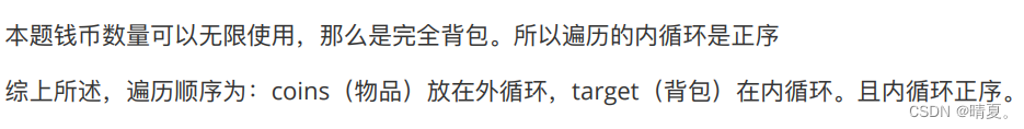 但本题和纯完全背包不⼀样,纯完全背包是能否凑成总⾦额,⽽本题是要求凑成总⾦额的个数!