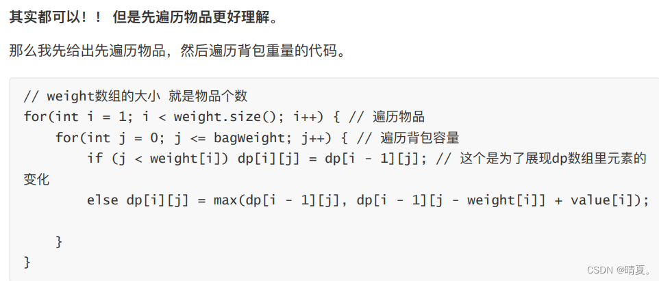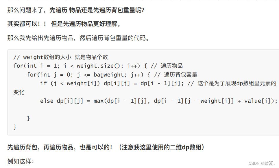 ⼆维dp数组01背包先遍历物品还是先遍历背 包都是可以的,且第⼆层for循环是从⼩到⼤遍历。