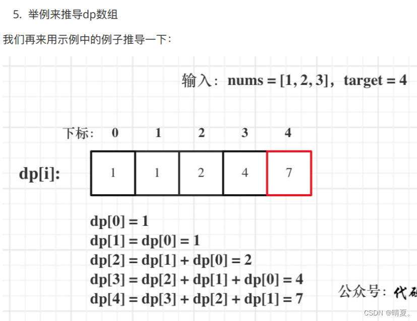 所以和为5的组合个数就是他们几个的和,也就是dp[5]=dp[1]+dp[2]+dp[3]+dp[4];