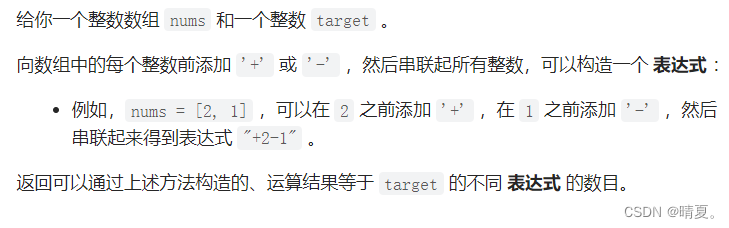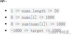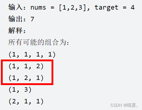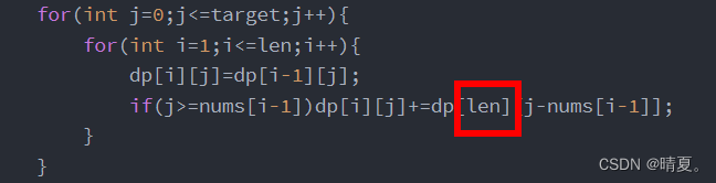public:int combinationSum4(vector& nums, int target) {int len=nums.size();vector> dp(len+1,vector (target+1));dp[0][0]=1;for(int j=0;j<=target;j++){for(int i=1;i<=len;i++){dp[i][j]=dp[i-1][j];if(j>=nums[i-1])dp[i][j]+=dp[len][j-nums[i-1]];}}return dp[len][target];}