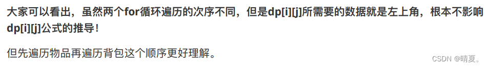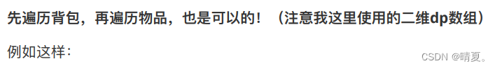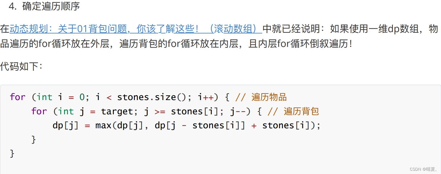 ⼀维dp数组01背包只能先遍 历物品再遍历背包容量,且第⼆层for循环是从⼤到⼩遍历。