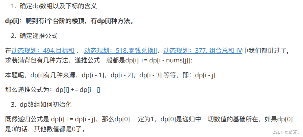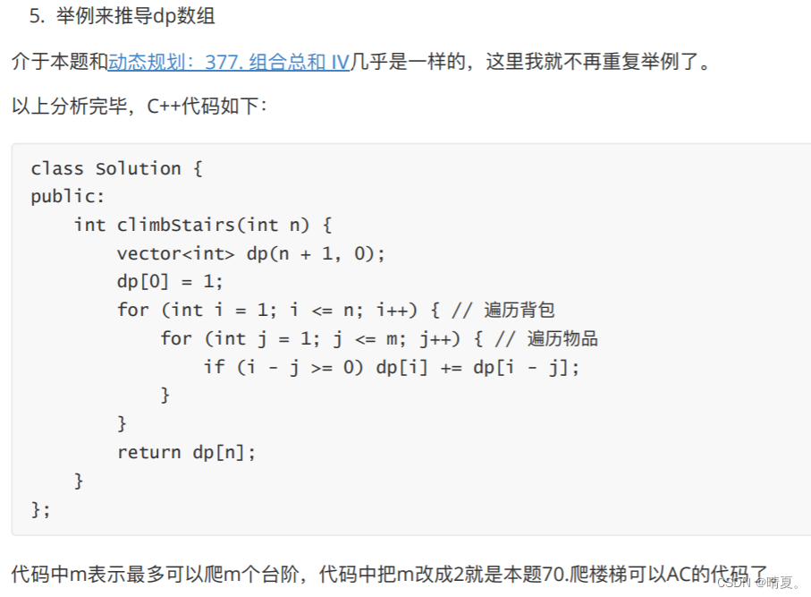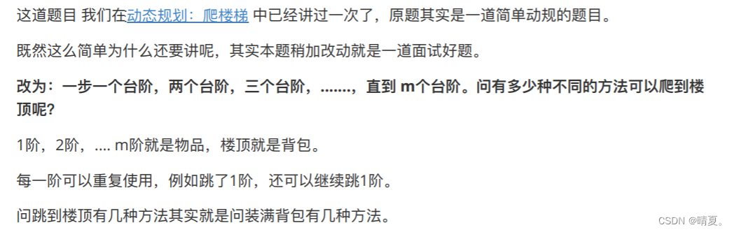 注意,此时的容量是n,即总共的台阶数,物品即为跳的步骤数目: