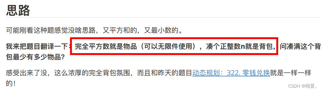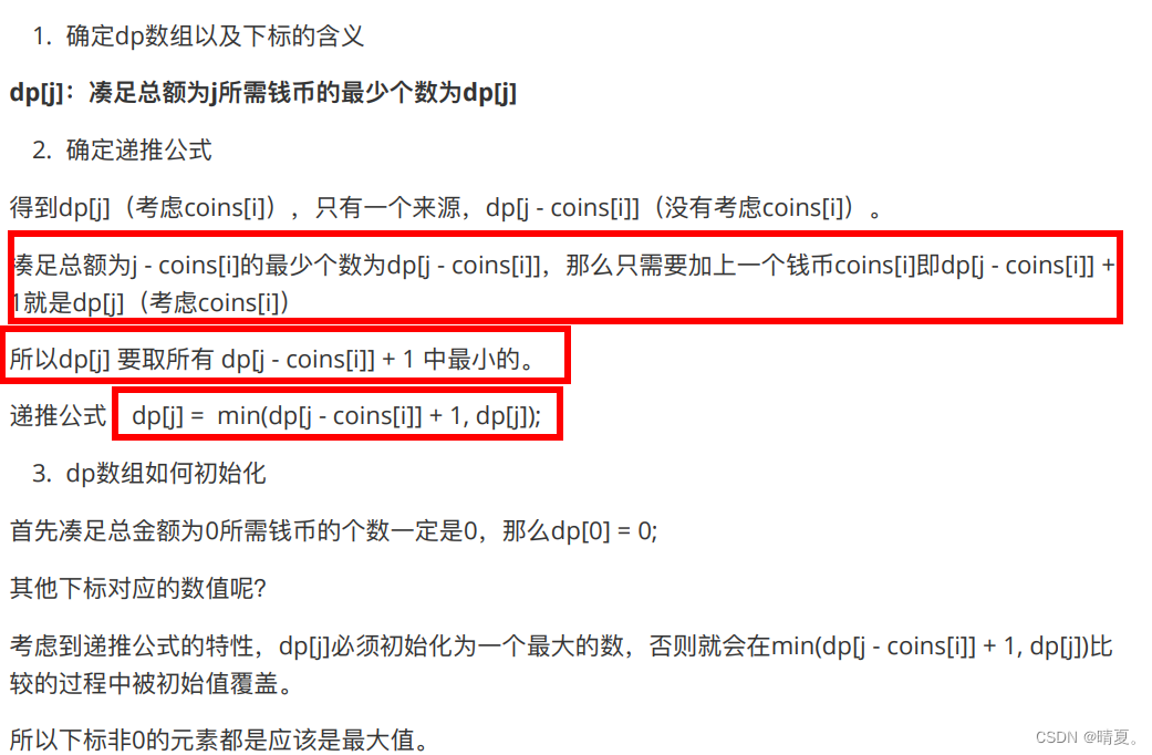 518题是求方法数,而本题是求最小数,核心模型都是背包模型,区别在于本题使用的递归方程是求最大最小值类型的。本题和原始背包一样,原始背包问题求的是最大价值,而本题求的是最小数量。都是求一个最大值,只不过原始背包问题的价值是有一个独特的value数组来衡量的,而本题的最小个数,可以直接衡量。
