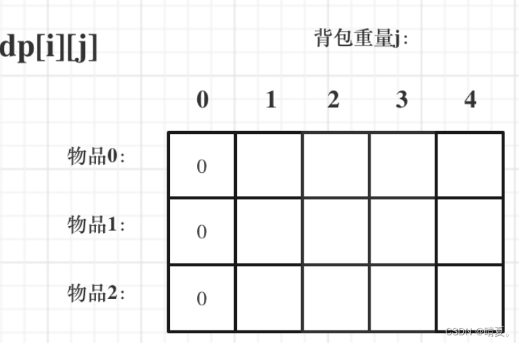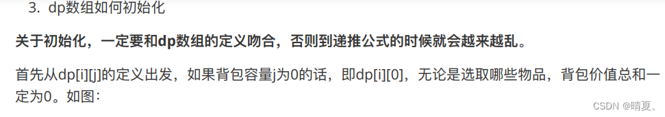 初始化时,我们可以放入第一个物品,然后循环的时候i从第二个物品开始循环,不过也可以不考虑第一个物品,都可以,这种情况全部初始化为0即可。(因为此时没有物品,价值自然为0)