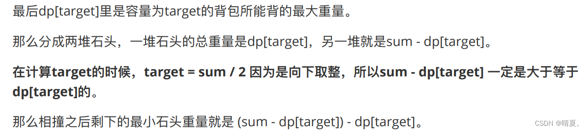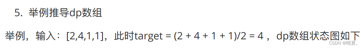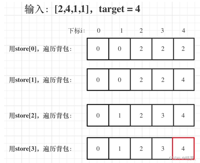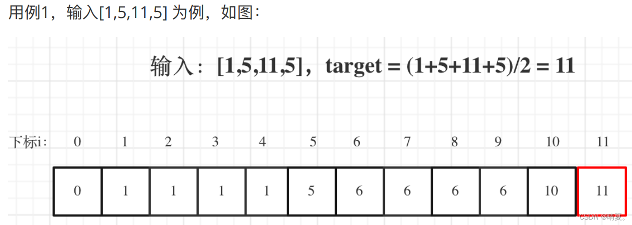 如果dp[i] == i 说明,集合中的⼦集总和正好可以凑成总和i,理解这⼀点很重要。