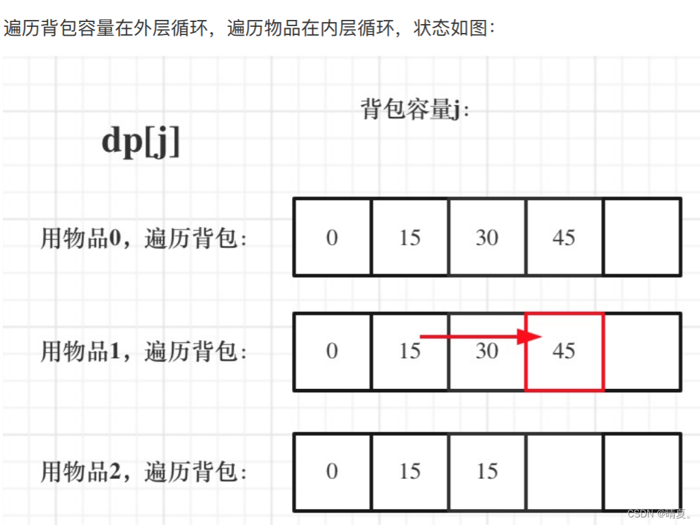 另一方面在完全背包中,对于⼀维dp数组来说,其实两个for循环嵌套顺序同样⽆所谓! 因为dp[j] 是根据 下标j之前所对应的dp[j]计算出来的。 只要保证下标j之前的dp[j]都是经过计算的就可 以了。 遍历物品在外层循环,遍历背包容量在内层循环,状态如图: