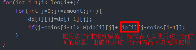 public:int change(int amount, vector& coins) {int len=coins.size();vector > dp(len+1,vector (amount+1));dp[0][0]=1;for(int i=1;i<=len;i++){for(int j=0;j<=amount;j++){dp[i][j]=dp[i-1][j];if(j-coins[i-1]>=0)dp[i][j]+=dp[i][j-coins[i-1]];}}return dp[len][amount];}