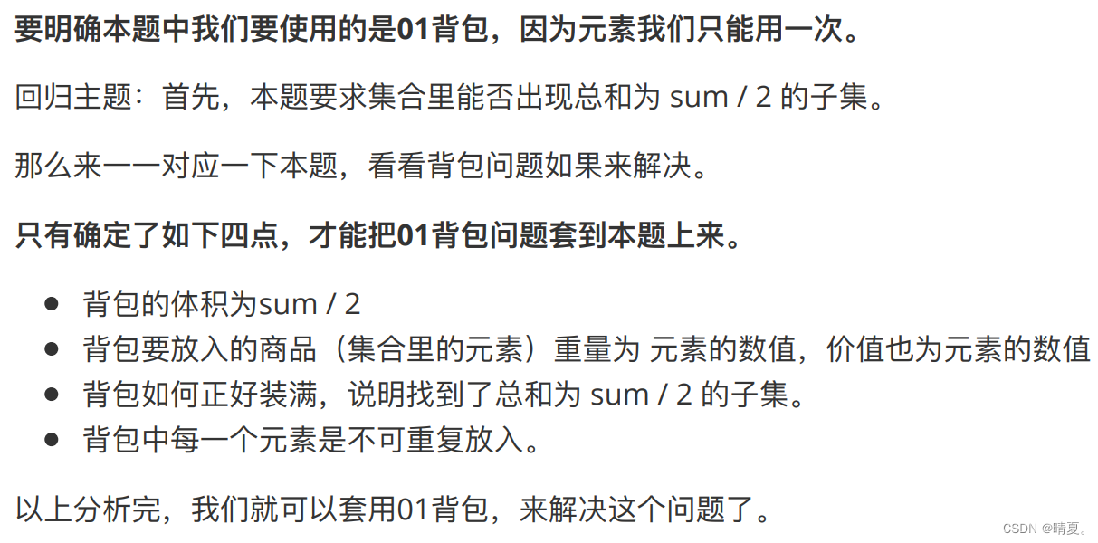 本题,相当于背包⾥放⼊数值,那么物品i的重量是nums[i],其价值也是nums[i]。