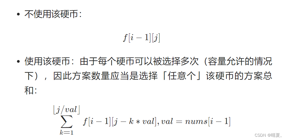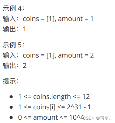 class Solution {public int change(int cnt, int[] cs) {int n = cs.length;int[][] f = new int[n + 1][cnt + 1];f[0][0] = 1;for (int i = 1; i <= n; i++) {int val = cs[i - 1];for (int j = 0; j <= cnt; j++) {f[i][j] = f[i - 1][j];初始时该行值为0,所以使用上一行来进行初始化,代表使用了上一轮的货币后,现在有多少种方法for (int k = 1; k * val <= j; k++) {f[i][j] += f[i - 1][j - k * val]; }}}return f[n][cnt];}